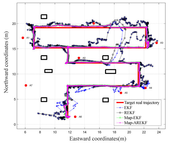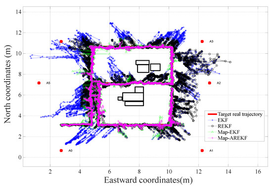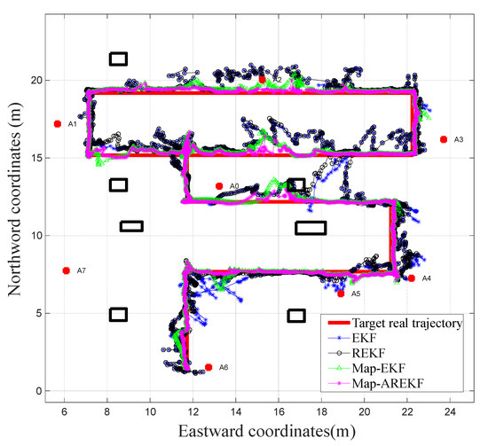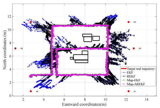 The site selected in Experiment 3 is more complex than Experiment 1 and Experiment 2. In the process of building the LOS/NLOS information map of the anchor, we considered the height of the average human body and set the objects in the site that were taller than 1.35 m as obstacles. As in Experiments 1 and 2, a 0.5 m interval was used to build the anchor LOS/NLOS information map. Figure 23 shows the results of tag movement trajectory in Experiment 3. It can be seen that the localization solutions of both the EKF and REKF algorithms are severely affected by NLOS, while the Map-EKF and Map-AREKF algorithms, which are filtered by the LOS/NLOS case of the anchor, are able to effectively avoid the effect of NLOS errors. This also visually illustrates the effectiveness of the algorithms designed in this paper in complex environments.