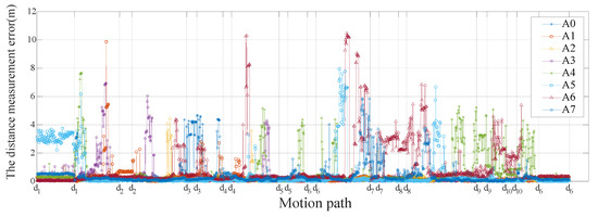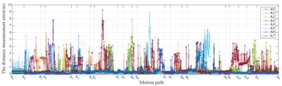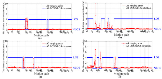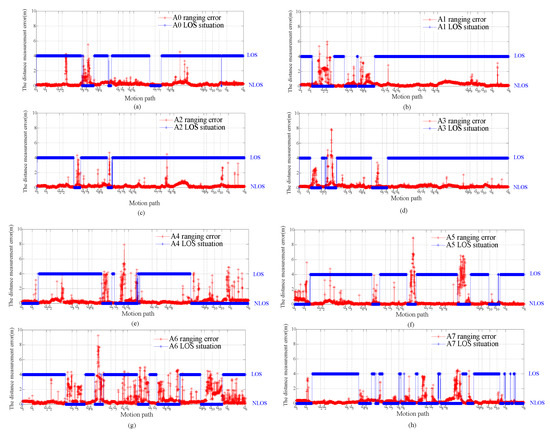 Comparison of LOS selection and ranging error of each anchor under the path of Experiment 2. (a) A0 situation; (b) A1 situation; (c) A2 situation; (d) A3 situation; (e) A4 situation; (f) A5 situation; (g) A6 situation and (h) A7 situation.