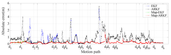 Compared with Experiment 3, the error of the Map-EKF algorithm in Experiment 4 is higher than that of Map-AREKF. This also shows that although the Map-EKF algorithm can handle the effect of spatial NLOS well using the anchor LOS/NLOS information map, it cannot handle the NLOS caused by random human occlusion.