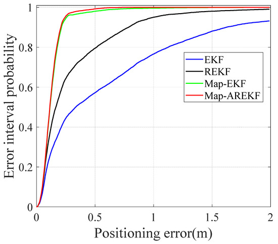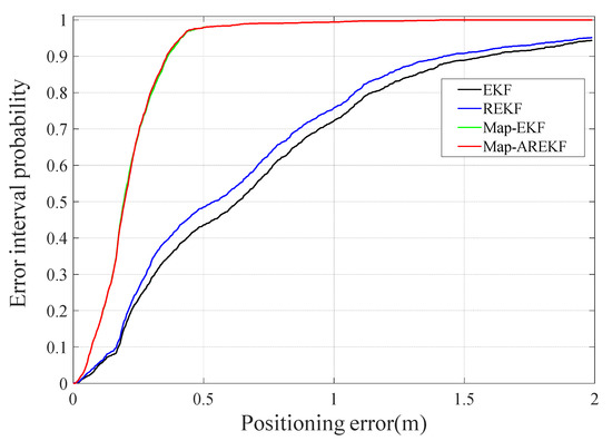 Taking Figure 26a as an example, 75% of the localization errors of the EKF algorithm in Experiment 3 are within 1 m and 80% of the localization errors are within 1.2 m; 92% of the localization errors of the REKF algorithm are within 1 m and 80% of the localization errors are within 0.55 m; 80% of the localization errors of the Map-EKF algorithm designed in this paper are within 0.185 m and 90% of the localization errors are within 0.225 m. The results of the Map-AREKF algorithm based on the adaptive improvement are essentially the same as those of the Map-EKF algorithm.