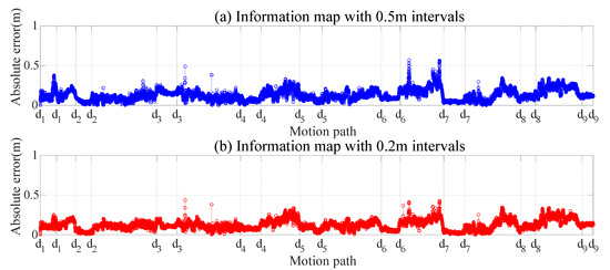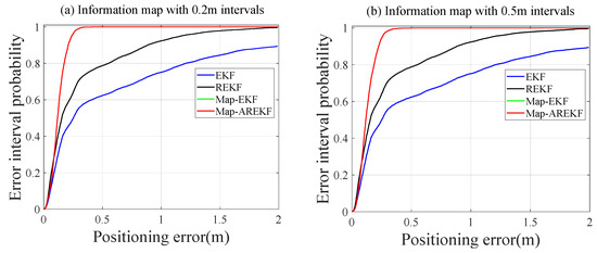 Figure 24 shows the effect of solution of the 4 algorithms in Experiment 3 using the LOS/NLOS information maps of the anchors built with 0.2 m intervals. Figure 25 shows the Map-AREKF algorithm errors with the two different information map sampling intervals. Figure 26 shows the error probability statistics for the algorithms with two different information map sampling intervals. The data for both cases remain basically the same, and it can be seen that the change of the information map sampling interval has little effect on the Map-EKF and Map-AREKF algorithms. In comparison, the smaller the interval is set, the finer the distinction between LOS/NLOS. The selection of the sampling intervals of the information map should be less than the minimum distance between adjacent signal-obscured objects. Considering the real passable indoor environment, we suggest that the sampling interval of the information map be less than or equal to 0.5 m.
