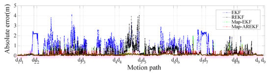 The localization results solved by the four algorithms in Experiment 4 are shown in Figure 27. It is obvious from the figure that Map-AREKF significantly outperforms Map-EKF when random human interference is added. Figure 28 shows the absolute errors of the four algorithms. Figure 29 shows the error probability statistics for the 4 algorithms, from which it can be seen that 57% of the localization errors of the EKF algorithm are within 0.5 m; 80% of the localization errors of the REKF algorithm are within 0.5 m and 90% of the localization errors are within 0.8 m; 90% of the localization errors of the Map-EKF algorithm designed in this paper are within 0.21 m; and in the Map-AREKF algorithm based on the adaptive improvement, 90% of localization errors are within 0.2 m, which is slightly better than the Map-EKF.