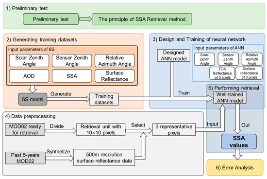 TOA reflectance is determined by AOD, SSA, and surface reflectance. In Section 3.1, we conducted some theoretical experiments to verify the feasibility of decoupling SSA and AOD. Through the preliminary test in the simulation of 3.1.2, it is proved that using the surface reflectance and TOA reflectance of a pair of surface pixels with different reflectance can distinguish the contributions of AOD and SSA to TOA reflectance, which allows us to directly retrieve SSA value from the surface reflectance and TOA reflectance of pixel pairs without determining the AOD first. Figure 1 shows the flow chart of this retrieval method. In our SSA retrieval method, we take the surface pixels in the range of 10×10 as a retrieval unit based on the assumption that the properties of aerosols are homogeneous in a certain area, in which we will look for the pixels with reflectance differences to participate in the retrieval and to decouple SSA and AOD contribution using the difference in the responsiveness to aerosol absorption caused by the difference of surface reflectance. The red band (band 1 in MODIS, 620 nm–670 nm, with 500 m resolution) that is more sensitive to SSA changes than other visible bands is selected to retrieve SSA. Based on the non-linear characteristics of the relationship between reflectance and SSA and the need to simplify the retrieval method, the ANN technique is chosen to establish the relationship between reflectance and SSA values to realize the SSA retrieval in the visible waveband. The method includes six main steps: (1) preliminary test, (2) generating training datasets, (3) designing and training of neural network, (4) data preprocessing, (5) obtaining the retrieval SSA results, and (6) error analysis of the ANN model results. Details of each step are shown below.