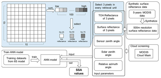 Cloud mask data from MOD35 is used to remove cloudy pixels before inputting parameters into the ANN model. Each retrieval of each retrieval unit requires 9 input parameters, namely the cosine of the three angles (solar zenith angle, sensor zenith angle, relative azimuth angle between solar and sensor), the reflectance of the darkest, middle, and brightest surfaces, and their corresponding TOA reflectance in one retrieval unit. For the three input parameters of angles, we take the value of the center pixel of the retrieval unit in the observation data as the input. To provide the surface reflectance information required for the retrieval input, an 8-day 500 m surface reflectance dataset containing seasonal variation was synthesized from 5 years (2014–2018) of MOD02 data using the minimum reflectivity technique [36]. The synthesized surface reflectance dataset was used to search for pixel sequences of different reflectances for SSA retrieval (as shown in the blue part of Figure 2). The pixels are sorted according to the surface reflectance of the red band in a retrieval unit. The No. 25, No. 50, and No. 75 pixels from minimum to maximum are taken into the SSA retrieval algorithm as a sequence of pixels representing different reflectances. Using the surface reflectance and TOA reflectance of the three selected pixels, we filled in the remaining 6 input parameters.