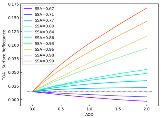 Relationship between the TOA-surface reflectance (the difference between TOA reflectance and surface reflectance) and AOD under different SSA conditions (surface reflectance = 0.1, solar zenith angle = 0°, sensor zenith angle = 0°, relative azimuth angle = 160°).