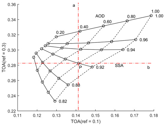 The line a (ref = 0.1) or line b (ref = 0.3) in Figure 4 are depicted to show that it was ill-posed to derive the unique combination of AOD and SSA for a certain value of TOA under single-surface reflectance due to the coupling contrition of AOD and SSA; while, the disjoint of all contour lines of AOD or SSA within the two-dimensional coordination indicated this coupling relationship could be disentangled with two different surface reflectances (Figure 4). For example, the point P derived from the intersection of line a and line b determined the exclusive combination of AOD and SSA.