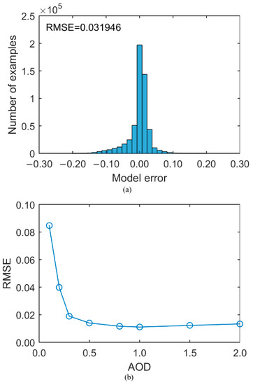 (a) The error distribution histogram of the ANN model. (b) Relationship between RMSE and AOD (environmental parameter settings: solar zenith angle = 20°, sensor zenith angle = 40°, relative azimuth angle = 60°).