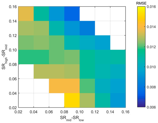 RMSE for different surface reflectance differences. SRlow, SRmid, and SRhigh are the lowest, middle, and highest reflectance among the participating pixels (environmental parameter setting: solar zenith angle = 30°, sensor zenith angle = 50°, relative azimuth angle = 120°, AOD = 0.8).