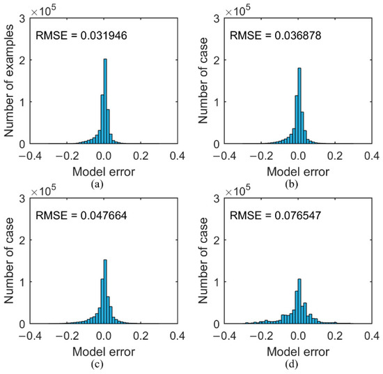 The error distribution of the ANN retrieval model on the validation dataset is shown in Figure 5a. The error of the ANN model conforms to a normal distribution and the RMSE of the ANN retrieval model is 0.0319.
