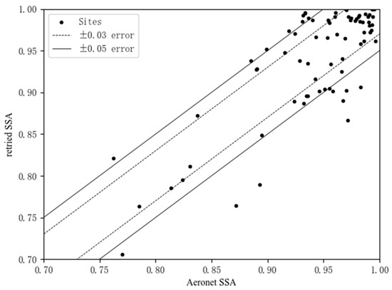 During the validation process, the SSA values retrieved from the pixels within 10 km × 10 km around AERONET sites were compared with the inversion results of the AERONET sites.