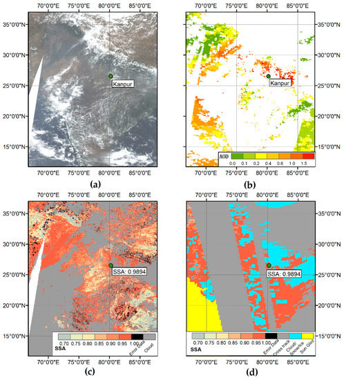 (a) True color composite map from MODIS (data came from Terra in South Asia on 25 June 2019), (b) AOD map of MOD04, (c) SSA retrieval value of our method, (d) SSA retrieval value (500 nm) of OMAERUV. The location and inversion SSA values of Kanpur site are marked in figures.