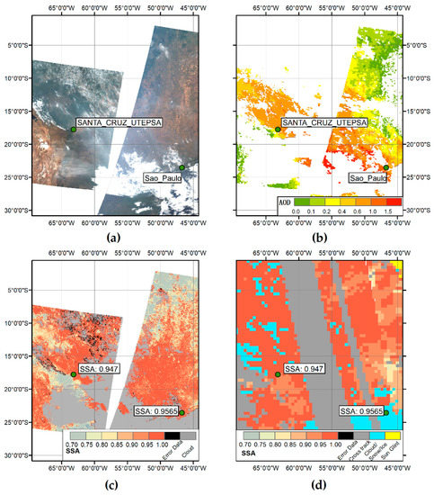 (a) True color composite map from MODIS (data came from Terra in South America on 19 September 2019), (b) AOD map of MOD04, (c) SSA retrieval value of our method, (d) SSA retrieval value of OMAERUV. The locations and inversion SSA values of SANTA_CRUZ_UTEPSA and Sao Paulo sites are marked in figures.