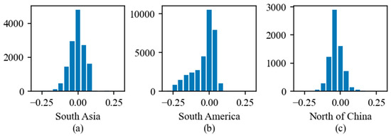 Difference histogram between our results and the OMAERUV product; (a) South Asia on 25 June 2019, (b) South America on 19 September 2019, (c) North China Plain on 1 January 2019.