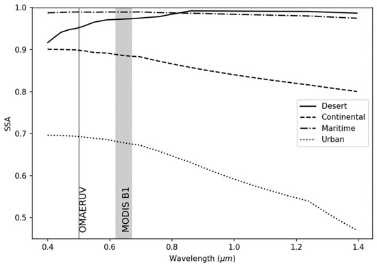 The ozone monitoring instrument (OMI) is one of the four sensors onboard the Aura satellite that was launched in 2004. The OMI near-UV aerosol data product (OMAERUV) uses 354 nm and 388 nm wavelengths to retrieve aerosol characteristics [18,21]. The OMAERUV product provides AOD, aerosol absorption optical depths (AAOD), SSA at three different wavelengths (354, 388, and 500 nm), aerosol index, and other ancillary and geolocation parameters in the OMI field of view (13 × 24 km).