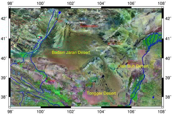 The BJD is in north-central China between longitude 100–104°E and latitude 39–42°N, and it covers about 49,300 km2 (Figure 1). The Heihe River delineates the western edge of the BJD. To the east, it is bounded by Yabrai Mountain and Alateng Mountain. As a part of the Alxa Plateau, the BJD is between 1000 and 2000 m above sea level, and this height increases from the northwest to the southeast. There are two kinds of dune patterns in the BJD: northeast-oriented crescentic dunes and complex star dunes []. More than 50% of the BJD is covered by megadunes with a height of 200–300 m. The highest dune, which is about 480 m, is located in the southeastern region of the BJD []. A total of 72 lakes, which are supported by groundwater, lie among the megadunes in the southeastern part of the BJD []. The desert is characterised by an arid climate [] and is regarded as one of the sources of Asia’s dust storms []. Precipitation increases from the northwest to the southeast, yielding mean annual precipitation of about 77 mm. The annual mean temperature around the BJD has increased by 0.4 myr−1 in the last 50 years, and the mean wind speed is decreasing in spring, summer, and autumn []. The average direction of the wind is from the northwest [], and as a result, the dunes move southeastwardly [].