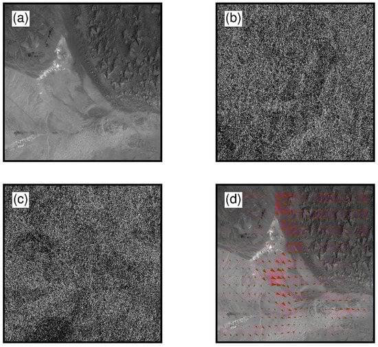 The new images and are complex, and the intensity and imaginary parts respond to the differences in the and directions, respectively. The cross-correlations of and were then processed using Equation (2), and the displacement was estimated. As shown in Figure 2, the Landsat 5 image (a) was converted into a complex orientation image with an intensity component (b) and an imaginary component (c), and the displacement map was shown as a vector field (d). It should be noted that after conversion to complex images, the reflection differences in the Landsat images were reduced.
