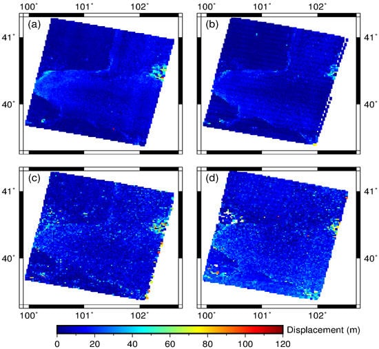 Displacement from 2005 to 2016: (a,c) Landsat 5 images were used as reference images, and (b,d) Landsat 7 SLC-off images were used as reference images; (a,b) images were processed using the DFT method, and (c,d) images were processed using COSI-Corr software. All of the results are unfiltered.