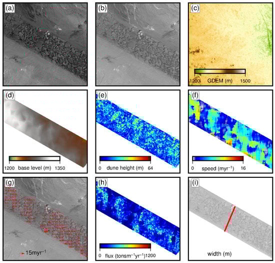 Estimation of the sand flux using remote sensing and DEM: (a,b) are the original Landsat 5 and 8 images, (c) is the raw ASTER GDEM, (d) is the “base level” estimated from the raw DEM, (e) shows the dune’s height, (f,g) show the displacement map and its vector field, (h) is the sand flux of each pixel, and (i) shows the width of the sand flux, which is perpendicular to the wind direction.