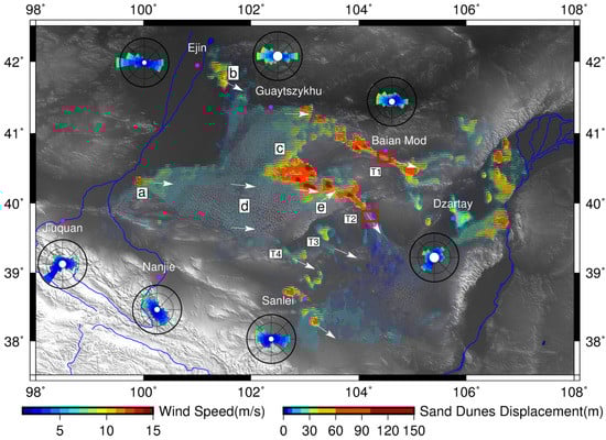 Displacement map of dunes in the BJD and the surrounding area. The white arrows show the directions of the local dune displacements. The wind roses show the wind direction and speed over the last 10 years: (a–e) show the locations of the different displacement areas, and (T1–T4) show the locations of sand transporting pathways from the BJD to the TD and UBD. The red rectangles show the area used for sand flux estimation.