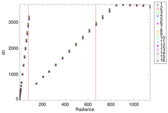 The calibration coefficients use the same averaged dns and SIS radiance from the dynamic range analysis to perform the regression fit described in Equation (6) and as an input into Equation (7). The residuals of those fits are evaluated against the 0.3% error budget allocation to assess characterization quality. The 2-sigma error bars are computed to assess the uncertainty in the knowledge of each coefficient in Equation (6). This guides the on-orbit LUT development where the τ variation across detector or TVAC plateau or the uncertainty straddling zero can be evaluated. The linearity, while not a requirement anymore, is still looked at to better understand possible on-orbit calibration challenges as low or high radiance scenes.