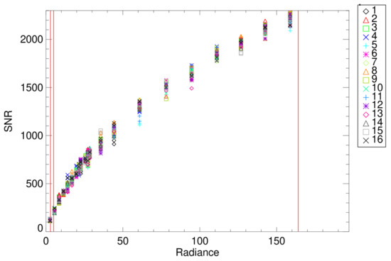 The signal-to-noise ratio (SNR) of band M10 for all detectors (colored symbols) as a function of SIS100 radiance (W/m2/µm/sr). The three vertical red lines are for Lmin (left), Ltyp (middle) and Lmax (right). Digital quantization noise is impacting the low signal levels in the bottom left corner of the image.