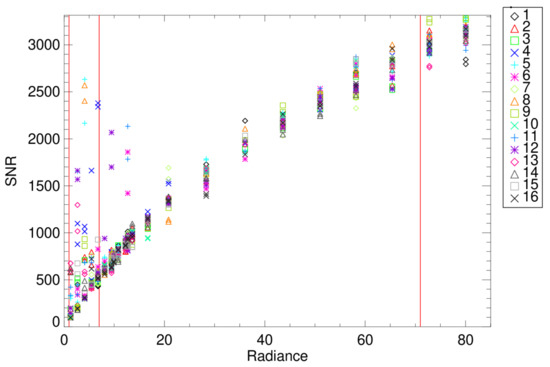 Similar to its heritage sensor MODIS, the VIIRS SDRs provide geolocated and radiometrically calibrated top-of-atmosphere (TOA) radiance, reflectance, and brightness temperatures. The SDRs use a combination of pre-launch tests and on-orbit calibrator data to provide National Institute of Standards and Technology (NIST) traceable SDR product outputs [8]. The EDR products use diverse scenes from dark/warm oceans to bright/cold clouds that require the instrument to have a large dynamic range with adequate signal-to-noise ratio (SNR) performance throughout [9,10,11]. To achieve this requirement, several bands (M1-M5, M7 and M13) have dual gains for high SNRs at both dark and bright scenes without saturating. Bands M1-M5 and M7 are used for the ocean color and chlorophyl EDR that has low TOA radiances while the land and atmosphere use them for very bright radiance scenes. Band M13 is a TEB used for active fire EDRs and therefore has a large TOA brightness temperature dynamic range requirement [12]. Table 1 lists the dynamic range requirements and SNR at a typical TOA radiance for the RSBs. The DNB has three gain stages to allow day, twilight, and night-time scenes to be observed without saturation and adequate SNR. Each of the gain stages for these bands requires individual characterization to allow a seamless SDR product to be created. Each band’s detectors and HAM sides are also characterized individually to reduce potential striping in the SDRs.