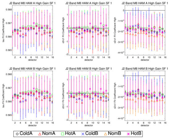 The pre-launch calibration coefficients for on-orbit use in the SDR algorithm use the radiometric characterization methodology discussed in Section 2. Each band, detector, HAM side, and gain have a set of coefficients computed for each TVAC temperature plateau and primary/redundant electronics side. There are also three FPA temperatures for the SWIR bands at nominal plateau that are not discussed here. Figure 8 shows an example of the regression coefficients τ, and from the SIS100 measurements for band M1 high gain for all TVAC temperature plateaus electronic sides. The first column corresponds to the tau coefficients as a function of detector with the different colors corresponding to the six-temperature plateau and electronic side combinations, the second column the and the third the . The rows show the results for the different HAM sides with the first being HAM A and the second HAM B. The whiskers on the points represent the two-sigma uncertainty in the coefficients using the covariance matrix of the least squares regression shown in Equation (6). There is variation in the τ (column 1) over detector and TVAC plateau that has a reverse correlation with the (column 2). For example, the black diamonds for TVAC cold plateau electronics side A are higher than the rest in the τ but lower than the rest in the . In an ideal measurement the τ should be a constant number over detector and temperature plateau due to it being a simple pin-hole screen placed between the SIS and the instrument. As seen in Figure 8, the τ is changing over detector and temperature. This indicates the τ in the regression fit of Equation (6) is absorbing errors in the measurements. This then causes the to balance in the opposite direction. The τ and correlation are even more evident in the band M1 low gain measurements where the less uniform TMCSIS is used.