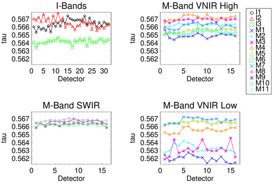 Comparison of the tau coefficient for all RSBs at nominal TVAC plateau. The upper left are the I-bands, upper right high gain VNIR M-bands, lower left the SWIR M-bands, and the lower right the low gain VNIR M-bands. The x-axis is detector, and the colors/symbols correspond to a particular RSB.