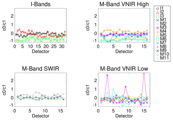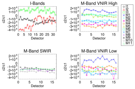 The τ, and regression coefficients are shown in Figure 11, Figure 12 and Figure 13, respectively, for all RSBs and detectors, HAM A, nominal B-side electronics. The upper left box shows I-bands I1-I3, upper right high/single gain VNIR M-bands M1–M7, lower right low gain VNIR M-bands M1–M5 and M7, and the lower left shows the SWIR M-bands M8–M11. The τ values in Figure 11 are consistent at around 0.566 for the I-bands, SWIR bands and the high gain VNIR bands. These bands all use the SIS100 during characterization. The VNIR low gain bands in the bottom right plot show two different groupings. The SIS100 data for bands M4, M5, and M7 are near 0.566 while the TMCSIS values for M1–M3 are near 0.563 and have more variability across detector. Figure 12 shows the with all the bands being near the zero line except for bands M2 and M3 low gain showing some spikes for a few detectors. The in Figure 13 shows the non-linear behavior does vary between bands. The 2-sigma uncertainty bars are not shown here, but they would be used to determine whether the coefficients straddle the zero line and could be considered statistically significant. As shown in Figure 10, the SWIR band M8 term uncertainties do lie outside the zero line and the other SWIR bands show similar non-linear characteristics. The dual gain M-bands show consistent non-linear behavior between high and low configurations even when the TMCSIS and SIS100 are used for each of those measurements, respectively. This indicates that the attenuator method reduces the SIS non-uniformity and instability uncertainties on the response shape characterization. Table 5 lists the coefficients for each band, gain state and TVAC temperature plateau using the calibration coefficient ratios and SIS100 radiance, as shown in Equation (7). While the non-linear response of the detectors should be consistent over TVAC temperature plateaus, the response term is expected to change with focal plane temperature. The correlates with instrument temperature with both increasing in value from cold-to-hot plateaus. The SWIR band change is much smaller (0.5–0.85%) than the VNIR bands (0.85–4%). This is expected since the SWIR focal plane is temperature controlled and the gain change is most likely due to EM temperature change while the VNIR has both OMM and EM sensitivities. Band M9 shows a large variation due to changes in the water vapor between plateau measurements. This effect is removed and not included in the on-orbit LUTs. JPSS-1 VIIRS has a nonlinear response behavior in the SWIR bands that is not present in S-NPP or JPSS-2 VIIRS. This requires JPSS-1 VIIRS to have a 3rd order polynomial term in its on-orbit calibration coefficient LUT to improve low radiance radiometric performance [22]. The JPSS-2 VIIRS LUTs are 2nd order polynomial fits, as with S-NPP.