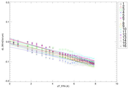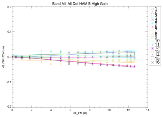The response change versus EM or focal plane temperature is measured during the transitions between TVAC plateaus. The rate of change in the response versus the delta temperature of either the EM or focal plane change is computed and is a correction to the calibration coefficients. With on-orbit calibration measurements only at the South Pole, intra-orbital temperature corrections of the calibration coefficients are required. Figure 14 and Figure 15 show an example of the band M1 response change (δL) as a function of temperature change (δT) for the EM and OMM, respectively, during the transition between cold and nominal plateaus. Each symbol represents a measurement captured during the plateau transition and each color corresponds to a detector within band M1. The fit lines in the figures are used to model the temperature sensitivities for requirements assessment and on-orbit look-up table (LUT) creation. The focal plane sensitivity for band M1 is on the order of 0.0015 W/m2/sr/µm per 1 K change in temperature. The on-orbit variations within one orbit are in the order of 2 K. This indicates the impact of the response sensitivity to temperature is around 0.0030 W/m2/sr/µm or less within an orbit. The band M1 response sensitivity to the EM is around −0.0051 W/m2/sr/µm over a 1 K range. Orbital EM temperature variation is expected to be within ~0.5 K, making the temperature sensitivity of the response to the EM temperature almost negligible. Table 6 lists the temperature sensitivities for all the bands for both the EM and OMM.