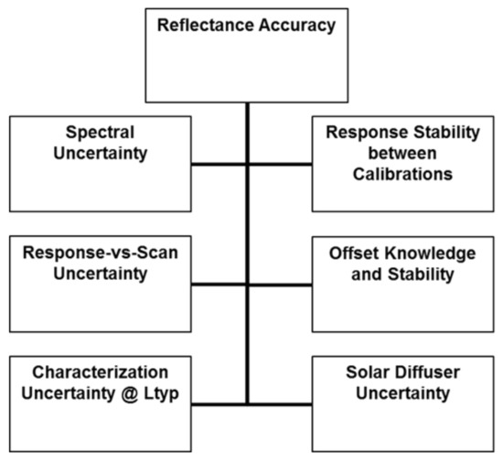 The RSB reflectance uncertainty is broken down into six contributors to the total uncertainty. Figure 16 shows the reflectance accuracy error tree contributors that are combined using a root sum square (RSS) into the top-level accuracy value. Each one of the boxes in Figure 16 has subcategories that are listed in Table 7 for all the RSBs. The values in Table 7 come from subassembly measurements (SD, SDSM), modeled data (Lunar, straylight, end-of-life degradation) and pre-launch instrument measurements. The main contributor to the on-orbit reflectance accuracy is the uncertainty in the SD bi-directional reflectance factor (BRF) and the ability of the SDSM to track the change in the BRF. All the bands meet the 2% reflectance accuracy uncertainty requirement except for band M1. The band M1 RVS degradation over the mission and the OOB response in the SDSM are the main contributors to the 2.3% uncertainty noncompliance. The pre-launch calibration coefficient characterization uncertainty discussed in previous sections is a small contributor to the overall radiometric uncertainty. This is a testament to the pre-launch calibration test equipment and measurement methodology.
