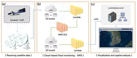 Processing chain for fully automated waterbody extraction for regular flood monitoring: (a) receiving satellite data, (b) deep learning-based flood area extraction on Amazon Web Services (AWS), and (c) visualization and spatial analysis.