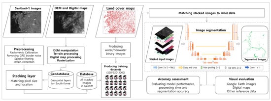 In academic, scientific, and practical aspects, the previous studies, however, lack (1) the accuracy of classification results, (2) frequency of analyses, (3) operation of presented models, and (4) continuity of flood monitoring systems, in addition to (5) spatial scale. As building fully automated flood monitoring systems has been constrained by obtaining, analyzing, and visualizing satellite data for this purpose, most existing flood monitoring systems have been developed mainly for experimental purposes at the laboratory level, and thus the operation of most of them are limited. In addition, although deep learning networks have shown great performance in image segmentation, they are not widely applied to flood monitoring using SAR data []. It is because developing deep learning-based waterbody extraction models is limited by difficulties in producing input data for training [], labeling of ground-truth data, optimization of network layers, and determining hyperparameters for producing an optimal model, in addition to determining the size of input image patches.