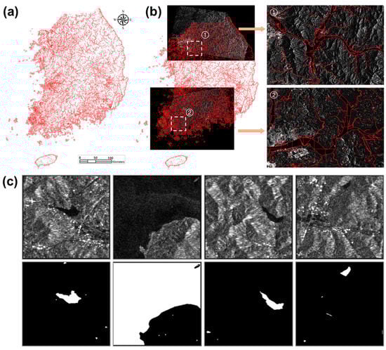 Two main input datasets for producing an initial deep leaning-based waterbody extraction model are Sentinel-1 images and land cover maps. To generate label data for deep learning model training and verification, detailed land cover maps of Republic of Korea were used, which were produced by the Ministry of Environment of Republic of Korea. The maps were produced using aerial photographs and satellite data including KOMPSAT-2, Landsat 7/8, and SPOT-5, after preprocessing and mosaicking of the satellite data. The accuracy of classification has been verified using reference data, such as digital maps, land registration maps, land use zoning maps, and forest-type maps, and through field survey. The final product maps, which have 41 land cover classes, are provided in shapefile format at 1:5000 scale. Of the classes, fresh water-related classes (i.e., rivers and lakes/reservoirs) were extracted and merged to produce label data, and verified through visual inspection for pixelwise class labeling (Figure 3a).