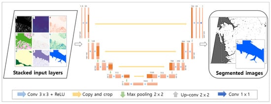 For operational purposes, it is well known that the usefulness of outputs from satellite-based flood monitoring is often hampered by the spatial resolution of satellite data, and comparing to input satellite data, the spatial resolution of output feature maps become coarser due to convolution by kernel and downsampling with pooling layers in convolutional neural network (CNN)-based deep learning architectures, which are for extracting higher-level feature maps []. Considering such factors, pixel-based image segmentation was selected as the base of deep neural networks for the fully automated flood monitoring system to prevent losing spatial feature information contained in the original input data. To exploit the geospatial layers for improving image segmentation accuracy, the U-Net architecture was customized and optimized, which was presented by []. The architecture has shown good performance in semantic segmentation with minimum training data while retaining feature information of input data [,]. The deep neural network presented in this research was optimized for analyzing geolocated satellite and geospatial data, which were stacked as multilayered GeoTiff images.
