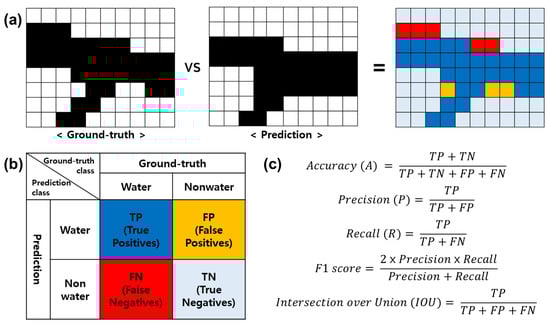 Accuracy assessment of image-segmented output images: (a) ground-truth data and prediction result for comparison; (b) confusion matrix for accuracy assessment; and (c) equations for evaluating accuracy, precision, recall, F1 score, and IOU.