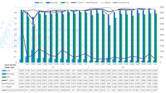 In addition to the image segmentation by waterbody ratio of input image patches, the accuracies of image segmentation by different band combinations of the eight input bands were evaluated to present the best deep learning model for the fully automated flood monitoring system. The analysis results of more 300 tests on optimal band combinations show that some band combinations yielded higher precision, recall, and F1 score than those of the VV input bands. The band combinations also showed lower loss than the VV bands. The 30% waterbody ratio showed relatively higher segmentation accuracies and lower loss than those of the 10% waterbody ratio. The precision, overall accuracy, IOU, recall, and F1 score of ‘VV, AS, TWI, and BF input bands’ (1467-0.3 in Figure 8) were 0.976, 0.956, 0.894, 0.964, and 0.970, and those of ‘VV, DEM, SL, BF input bands’ (1237-0.3 in Figure 8) were 0.962, 0.955, 0.890, 0.978, and 0.970, whereas those of the VV input bands were 0.943, 0.944, 0.857, 0.986, and 0.964, respectively. Training time for this result was between 317.0 and 3431.8 s, showing that the training time for some band combinations was faster than that for the VV input bands.