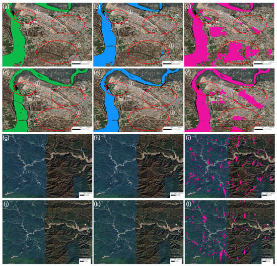 Automatically segmented Sentinel-1 images for 2020 and 2022: (a) VV, AS, TWI, BF combination for 2020; (b) VV, DEM, SL, BF combination for 2020; (c) VV for 2020; (d) VV, AS, TWI, BF combination for 2022; (e) VV, DEM, SL, BF combination for 2022; (f) VV for 2022; and (g–l) are zoom-in images of the red boxes shown in (a–f), respectively.