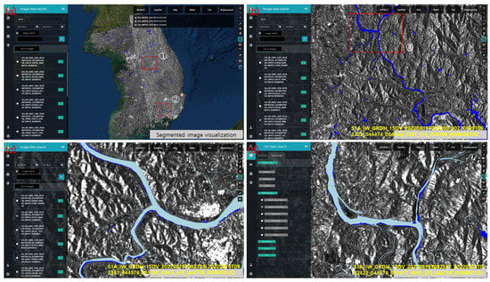 As explained in Section 2.1, after the analysis processes shown in the previous sections, the outputs produced on the cloud computing platform are sent to the local database server through cURL for visualization and further spatial analysis (Figure 11). The time required for visualization of outputs is negligible compared to the time for obtaining satellite data and image segmentation. The elastic cloud computing enabled stable analysis in part, reduced processing time, and shortened the time for obtaining satellite data. When river boundaries from digital maps (sky blue in Figure 11c,d) are overlaid on the segmentation outputs (blue in Figure 11a–d), the blue-colored areas outside the sky blue areas indicate flooded areas (see Figure 11c,d). Comparison between river boundaries and waterbody segmentation results is automatically performed without any human intervention to distinguish flooded areas. The visualization and spatial comparison provide information on flood situations at the time of satellite data acquisition, showing the operation of the fully automated flood monitoring system developed for this research. In this paper, although all available images are automatically downloaded and analyzed by the fully automated flood monitoring system, we present the segmentation results of 12 Sentinel-1 images in Figure 6 as examples. It was observed that all of the outputs of the fully automated flood monitoring system show similar segmentation accuracy, processing time, and stable performance, demonstrating robustness of the method presented in this research for flood monitoring.