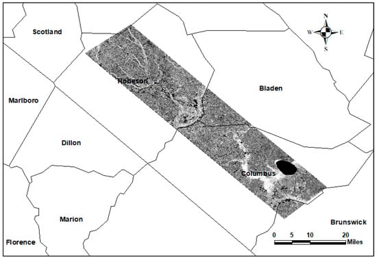 The study area was located in the eastern North Carolina coastal plain area. This area is a flood-prone area covered with dense vegetation affected by many hurricanes causing heavy rain and flooding in many counties in the state. In 2018, Hurricane Florence produced high amounts of precipitation, causing devastating flooding. Fifty-three people have been confirmed dead due to Hurricane Florence, and 77% of the causalities were in N.C.’s rural flood plain [23]. In addition, Florence was classified as one of the top 10 costliest hurricanes in United States history. As a result, FEMA identified 44 counties in the state of N.C. for federal disaster assistance. The study area is shown in Figure 1, where both UAVSAR data and S-1b SAR acquired on the same day are available.