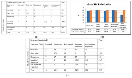 The accuracy assessment of the UAVSAR L-band full-polarized data for flood mapping: (a) confusion matrix for training the RF model, (b) producer and consumer accuracy, and (c) validation error matrix for the classification.