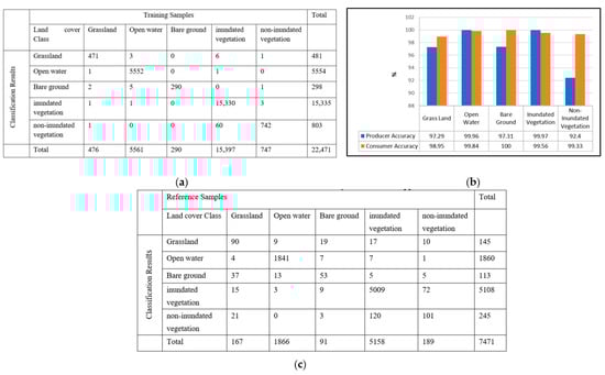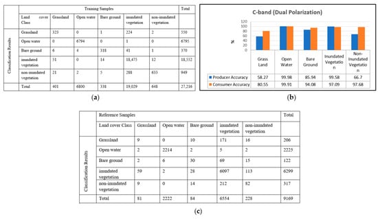 The accuracy assessment of the Sentinel C-band dual-polarized data for flood mapping: (a) confusion matrix for training the RF model, (b) producer and consumer accuracy, and (c) validation error matrix for the classification.