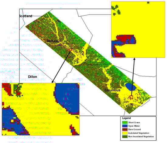 The linear polarization of VH was also analyzed and segmented using the RF method to create a flood map of the study areas. The results of the classification are described in Figure 3 and Figure 4.