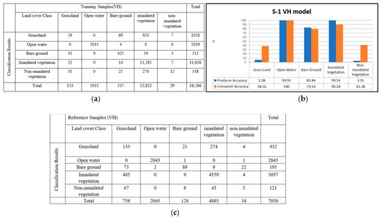 The accuracy assessment of the Sentinel C-band VH-polarized data for flood mapping: (a) confusion matrix for training the RF model, (b) producer and consumer accuracy, and (c) validation error matrix for the classification.