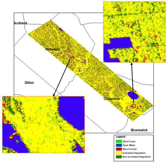 (c) L-band full polarization: This study also utilized the UAVSAR full polarization for flood mapping. The performance of the UAVSAR data classification is described in Figure 7 and Figure 8.