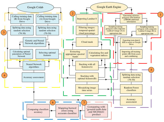 Figure 2 shows a flowchart of the proposed method for detection of burned areas. We used GEE and Colab cloud computing platforms to collect and process time-series images, generate training polygons, export reference data of burned and unburned areas, implement classifications, and validate the resultant accuracies of the models. Details about each step are provided in the following subsections.