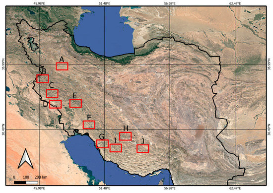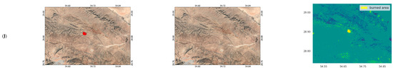 The coordinates and dates of wildfires that have occurred in Iran were extracted from Iranian Space Agency (ISA) website (Available online: https://www.isa.ir (accessed on 20 October 2021)) for 2020 and 2021. Sentinel-2 images were used to create the peripheral reference data. Moreover, Fire Information for Resource Management System (FIRMS) products were used to assist in creating the non-burned reference polygons, and MODIS (MCD64A1) products were also used to compare and evaluate the output of the models developed within this study, in the GEE environment [46].