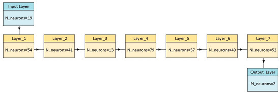 Optimum features were selected after the combined implementation of the GA and NN algorithms. Due to the high number of training points, high accuracy was obtained by the NN (Figure 6). As shown in Table 3, 19 out of 22 features were selected using GA. This algorithm also determined the optimal number of layers and neurons in each layer, as well as the activation function of the hidden layers and optimizer as listed in Table 4. The architecture of NN classifier was thus constructed as schematically shown in Figure 7.