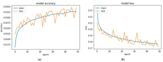 Comparison of (a) accuracy and (b) loss functions of the NN algorithm derived from the training and test datasets.