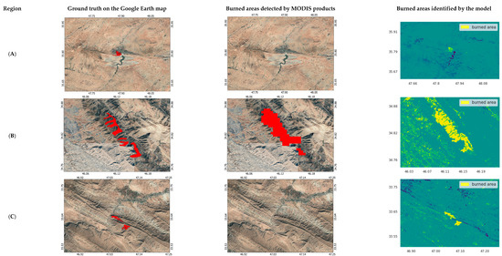 The left, middle, and right columns respectively show the actual burned areas in red reported by the Iranian Space Agency as the ground truth overlayed on the Google Earth map, the burned areas in red detected by MODIS products overlayed on the Google Earth map, and the burned areas in yellow identified by the proposed model in different regions (A–J).